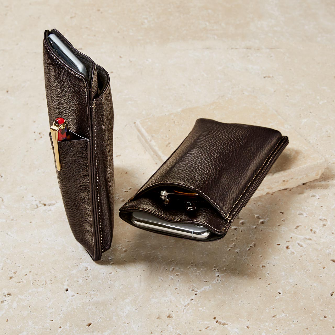 Glasses, phone, and a pen–that's the triad that makes up the everyday carry for some Levenger customers, and hence our designers developed this clever case. A phone slips into the center sleeve, lined with protective microsuede. Slip your specs on one side, your favorite traveling pen on the other. Your trio is ready to tour. Also available in .