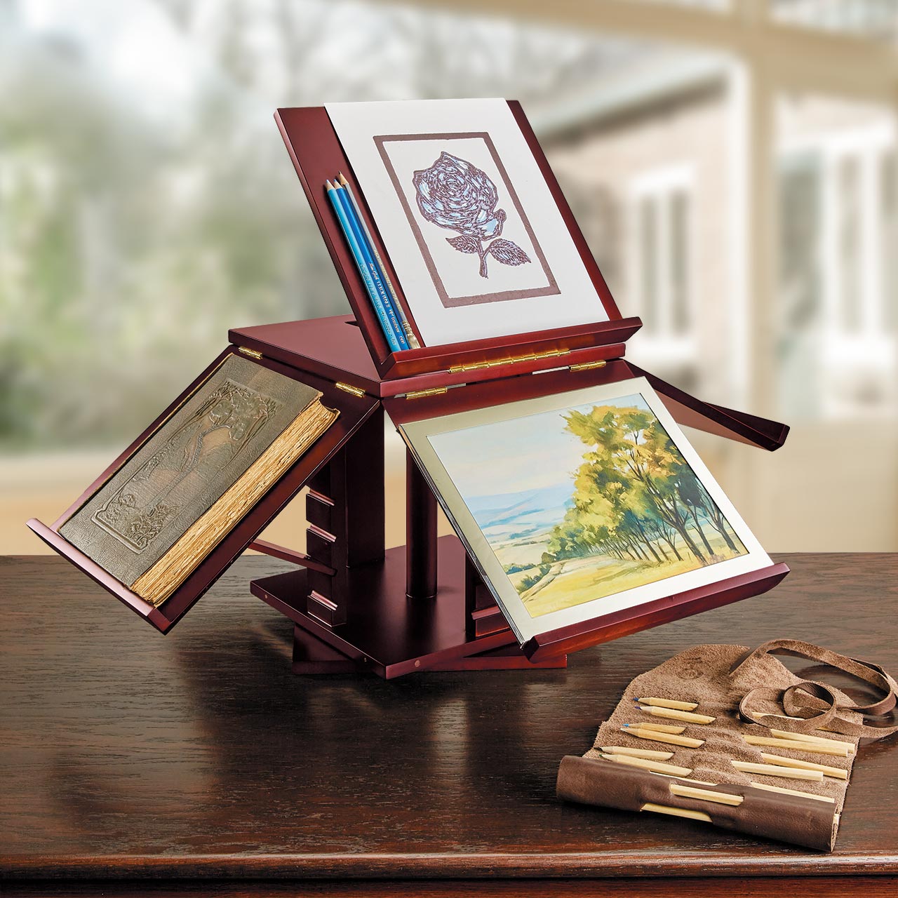 This Product Ships Free. A new world of reading unfolds. The Library-Go-Round adds a distinctive difference to your library, a unique way to show off your favorite tomes and a useful method of conducting research and taking notes. The five shelves of this revolving book display, inspired by one owned by Thomas Jefferson, can hold several books at various levels and angles and are also useful for note-taking and cross-checking information from several sources. The spinning lazy susan-style base of this rotating bookcase is perfect for spotlighting rare first editions, specialty books, favorite artwork and photographs. The Library-Go-Round folds up neatly into a 12" box when not in use.