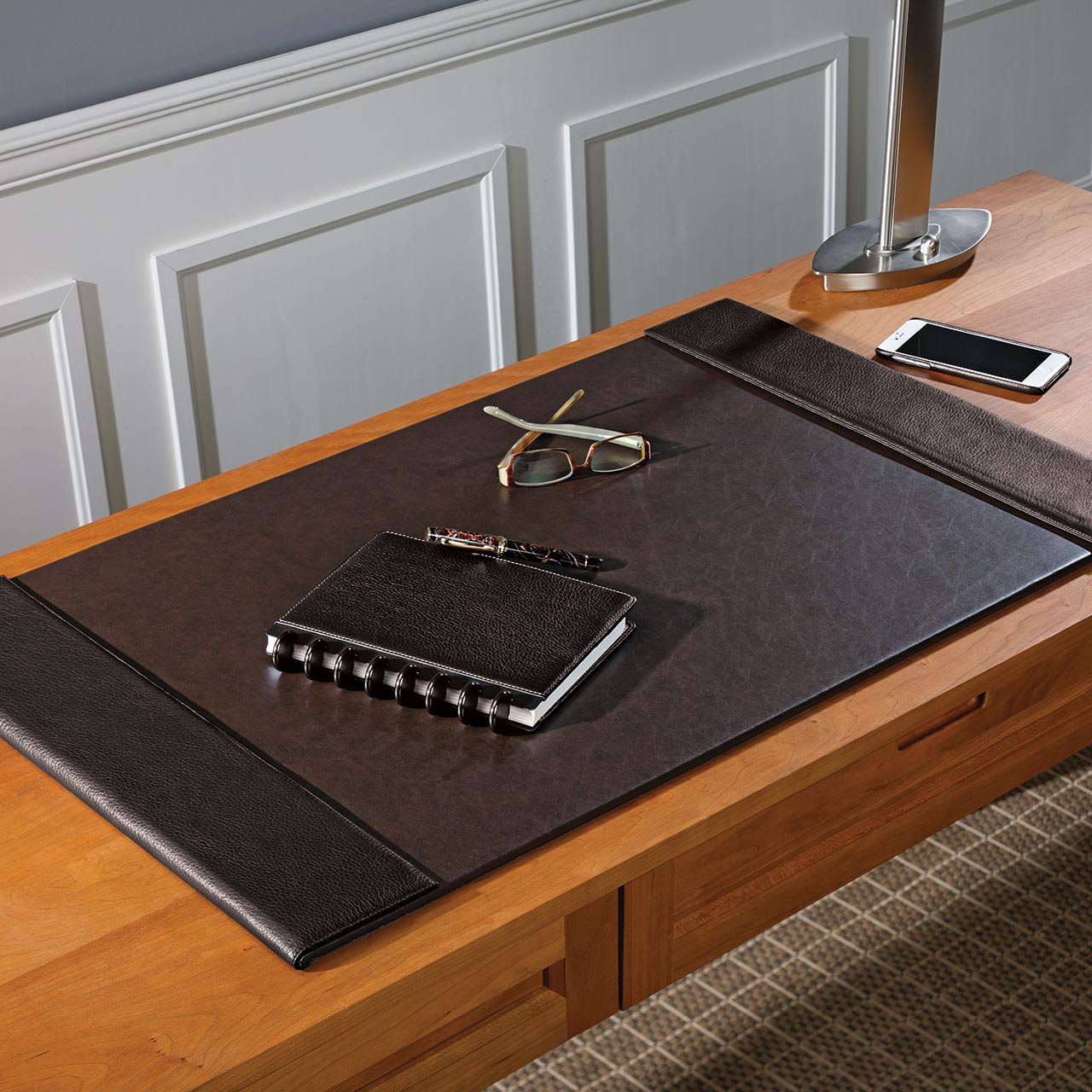A distinctive desk mat for larger desks. Our Bomber Jacket leather makes durable deskware and helps keep your workspace beautifully organized. The fold-up wings on either side offer card storage underneath: the left side can hold 15 business cards, and the right side 10 3 x 5 index cards. The smooth writing surface can be used with or without blotter paper, and the felt bottom protects your desk.