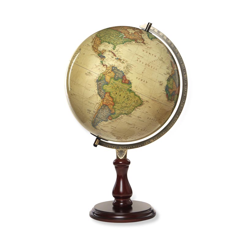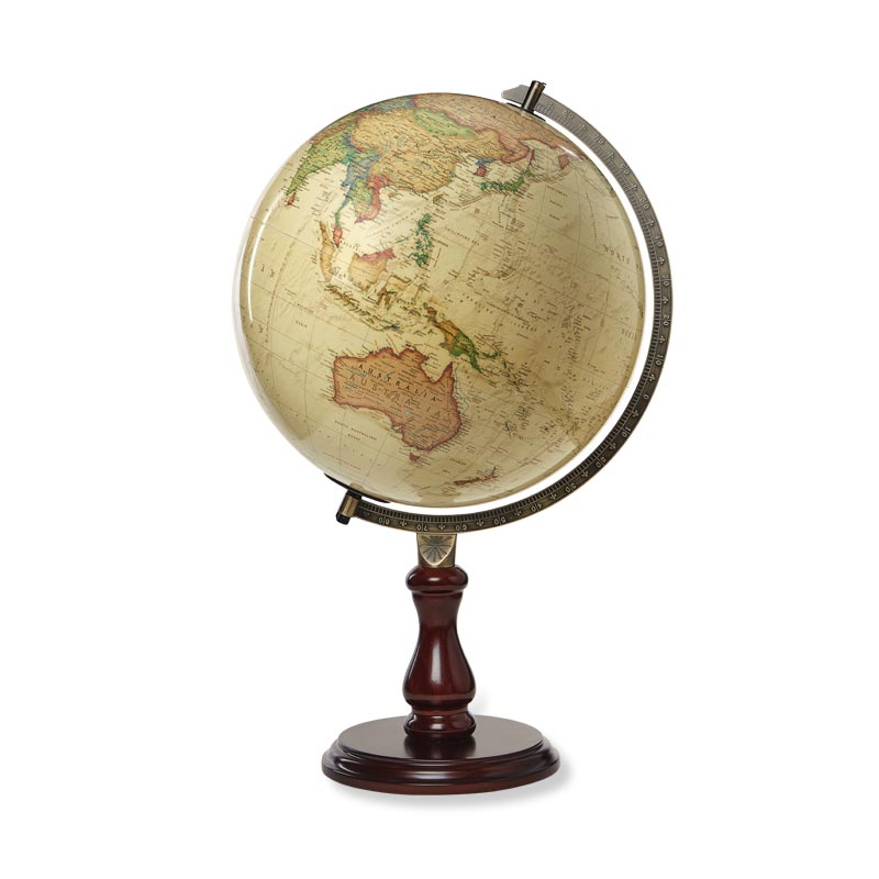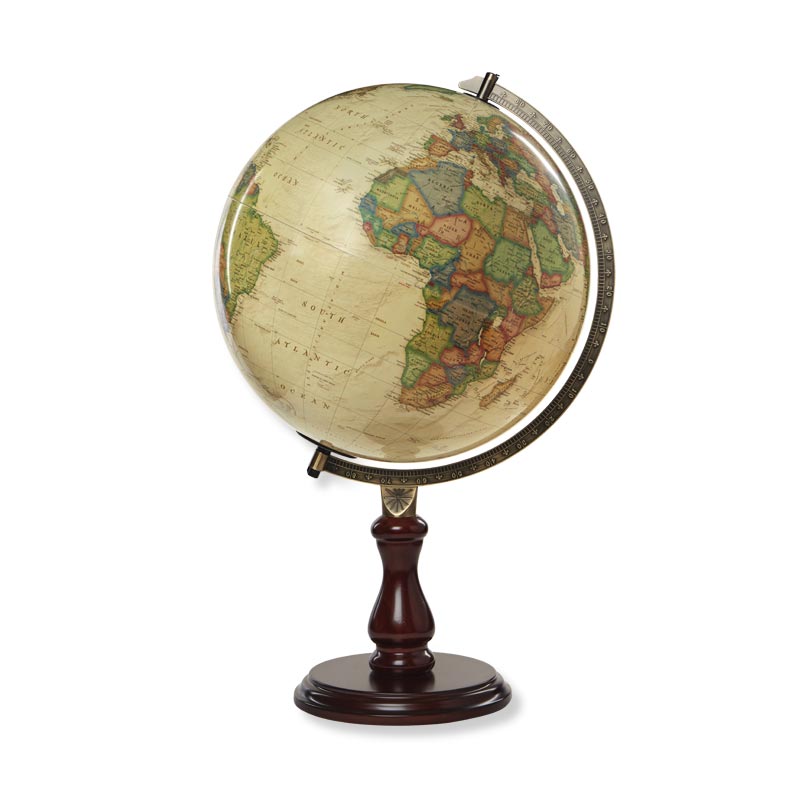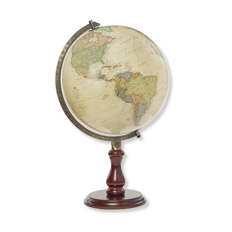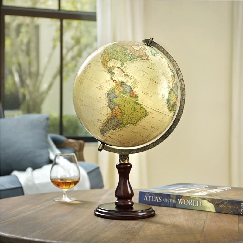 The world is yours with this exclusive Levenger globe design. Expand your worldview with the Expedition Globe, designed exclusively for Levenger by renowned globe maker Replogle of Chicago. Artisan-made by dedicated craftspeople skilled in the art of globe-making and featuring up-to-date cartography provided by National Geographic, this antiqued globe cites more than 3,500 locations and boundary markings. It stands upon a walnut-stained hardwood wood base anchored by its die-cast semi-meridian, numbered with the degrees of latitude, with a time dial at the North Pole. A Levenger 35th Anniversary Heritage Product. Made in the USA.