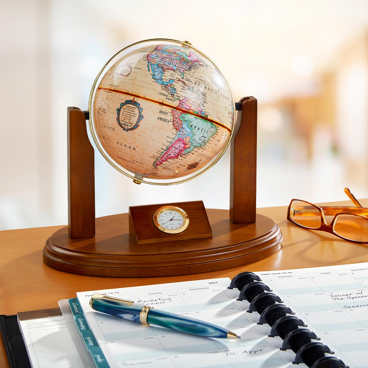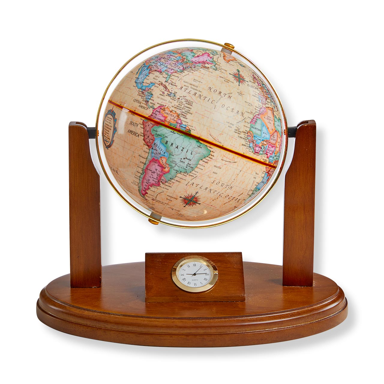 From the world-renowned Replogle globe makers of Chicago comes this unique table and desk clock that keeps the world at your fingertips. Featuring up-to-date cartography from January 2023, the handmade mini globe (made in the USA) is mounted on a solid hardwood base above the Gyro-Matic Meridian quartz clock.