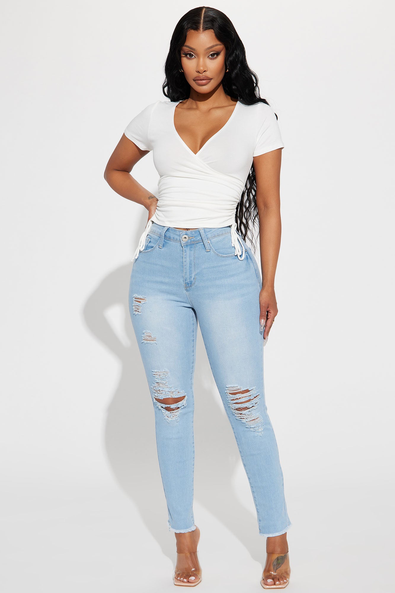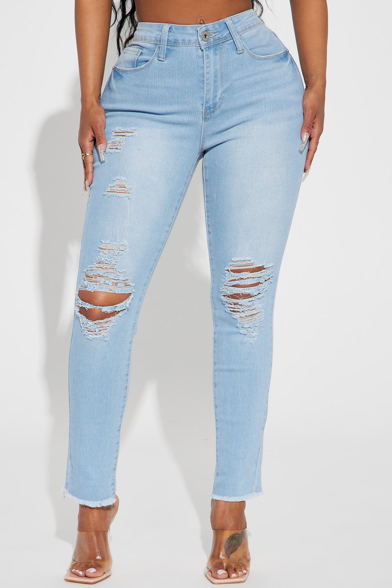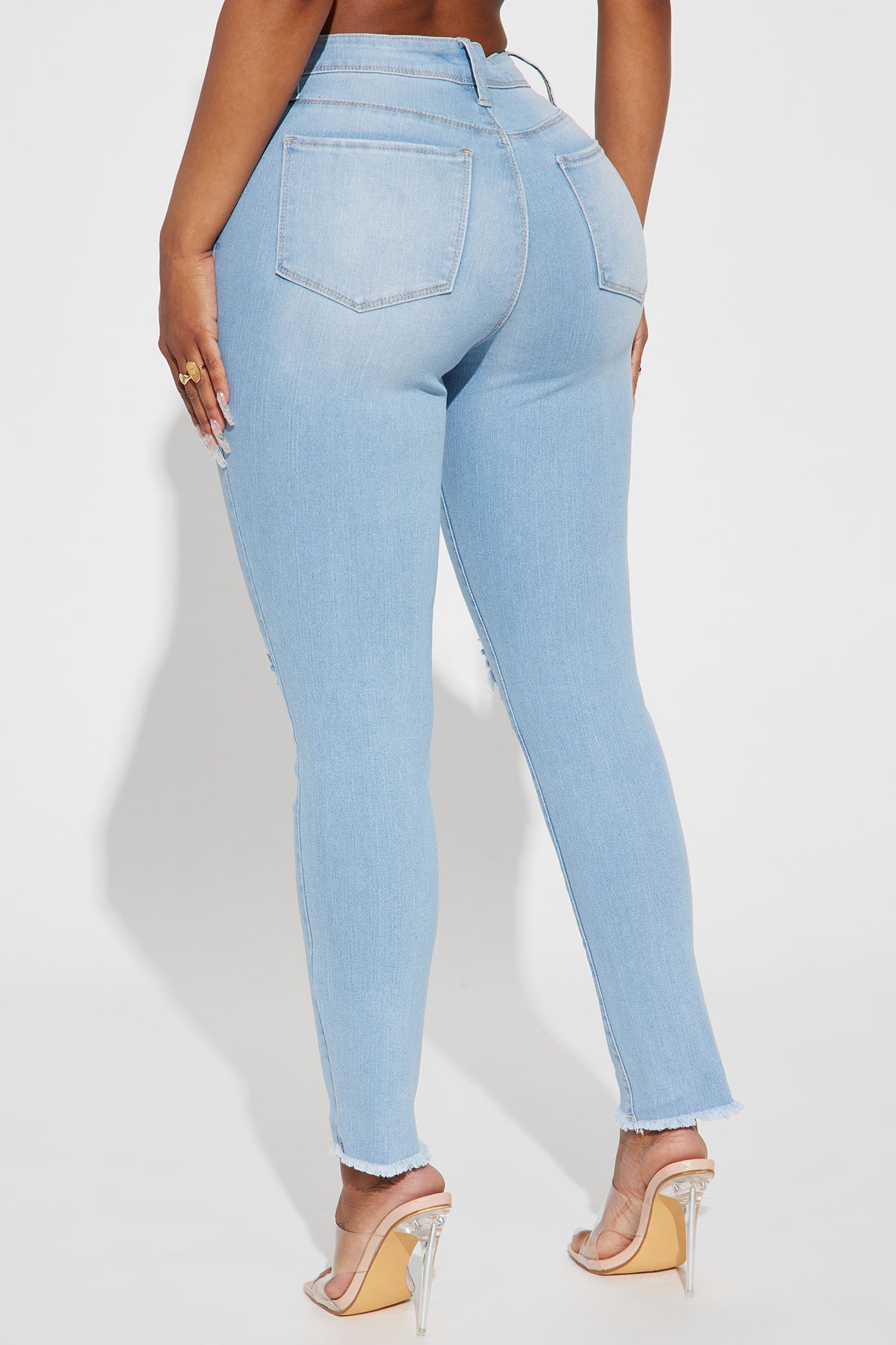 • In A Hurry Ripped Stretch Skinny Jeans - Light Wash