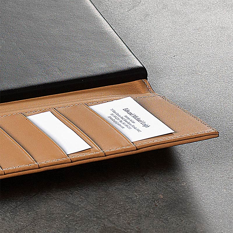 Create a great deskscape, starting with this full-grain leather desk mat. The Morgan leather desk blotter helps keep your workspace beautifully organized. The fold-up wings on either side offer card storage underneath: the left side can hold 15 business cards, and the right side 10 3 x 5 index cards. The smooth writing surface can be used with or without a desk pad or blotter, and the felt bottom protects your desk.