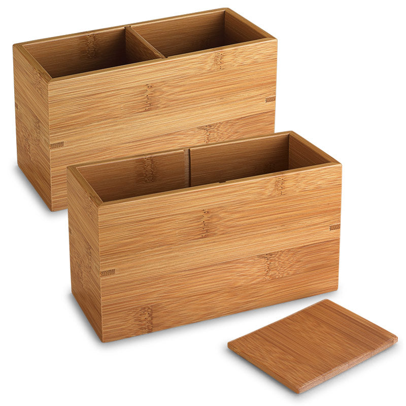 The horizontal note card box that transforms into a pen and tool holder. If you've ever seen how magic works, you know it's always done with a mere sleight of hand or simple illusory technique. Our Nantucket Note Card Box is a simple open horizontal box of solid bamboo, specially built for index cards, and it can transform into two vertical pen cups—just by adding a tiny partition in the middle.