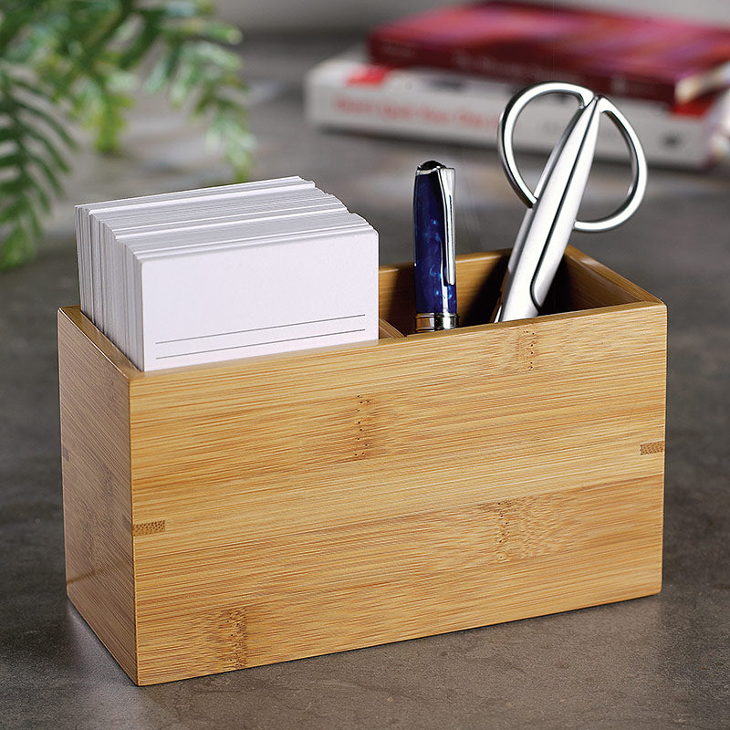 Horizontal note card box that transforms into pen cups—and includes 300 cards. If you've ever seen how magic works, you know it's always done with a mere sleight of hand or simple illusory technique. Our Nantucket Note Card Box is a simple open horizontal box of solid bamboo, specially built for index cards, and it can transform into two vertical pen cups—just by adding a tiny partition in the middle.